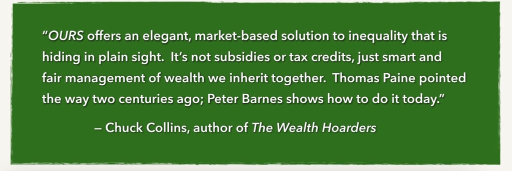 The ideas in this web site are drawn from the book OURS: The Case for Universal Property, by entrepreneur and writer Peter Barnes. It is available for purchase at bookstores and on-line.